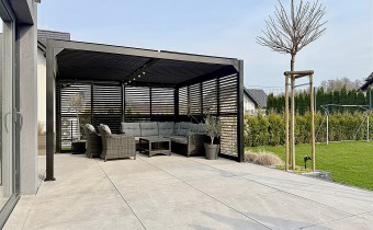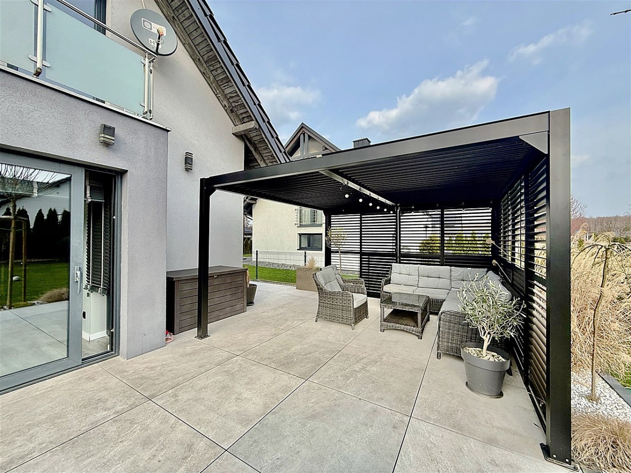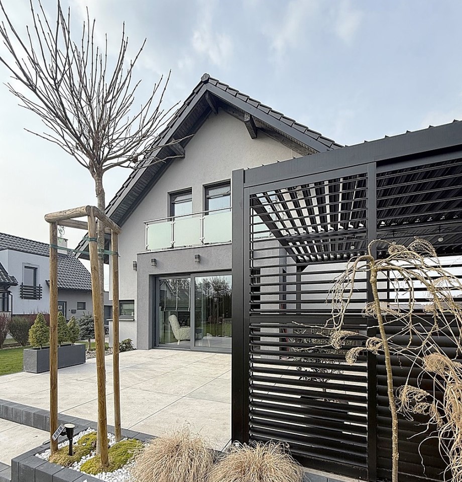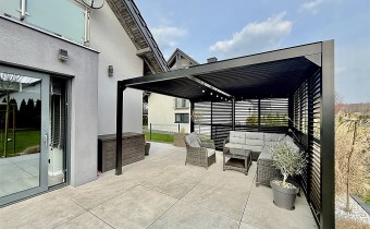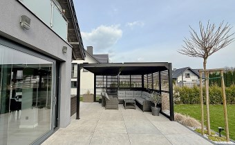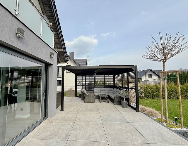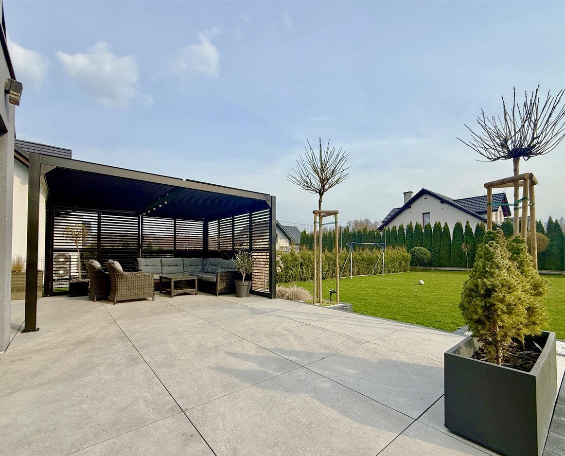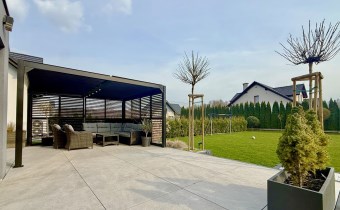 Od strony ogrodu znajduje się nowoczesny, zadaszony taras z przesuwnymi żaluzjowymi ściankami – idealny do relaksu i spotkań na świeżym powietrzu. Z okien rozpościera się widok na zadbany, zielony ogród.