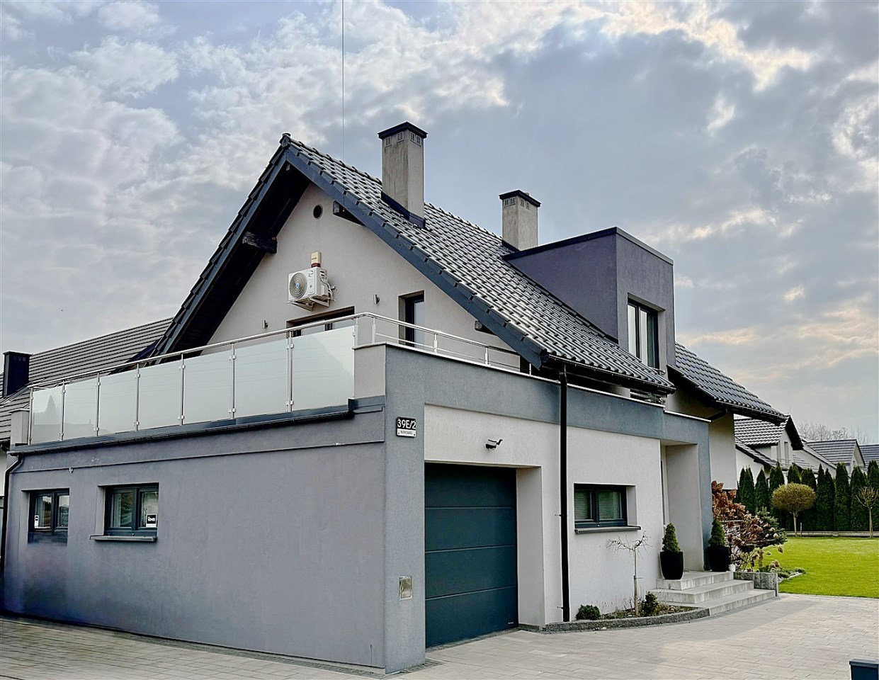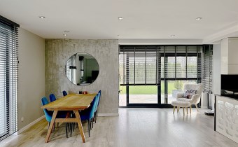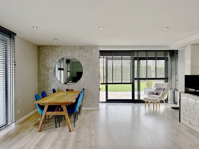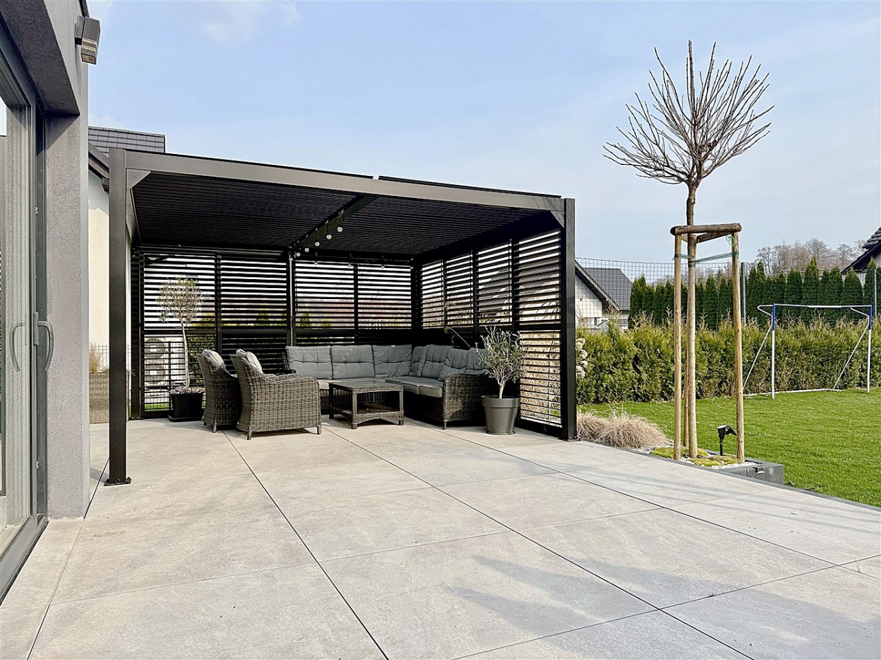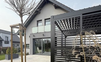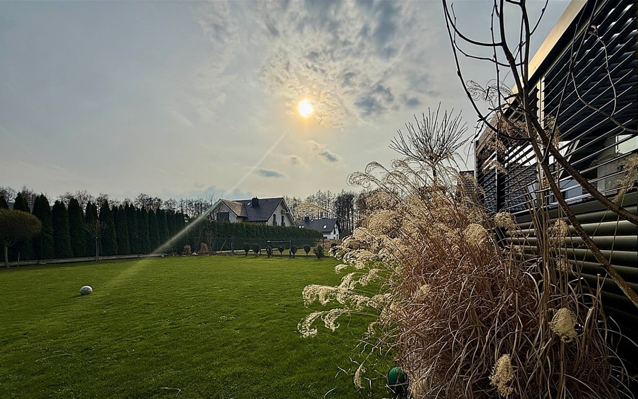 Od strony ogrodu znajduje się nowoczesny, zadaszony taras z przesuwnymi żaluzjowymi ściankami – idealny do relaksu i spotkań na świeżym powietrzu. Z okien rozpościera się widok na zadbany, zielony ogród.