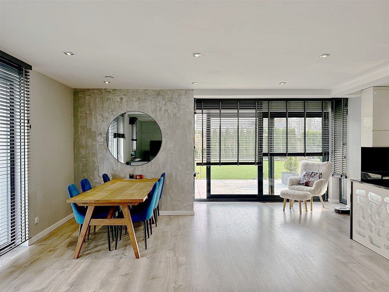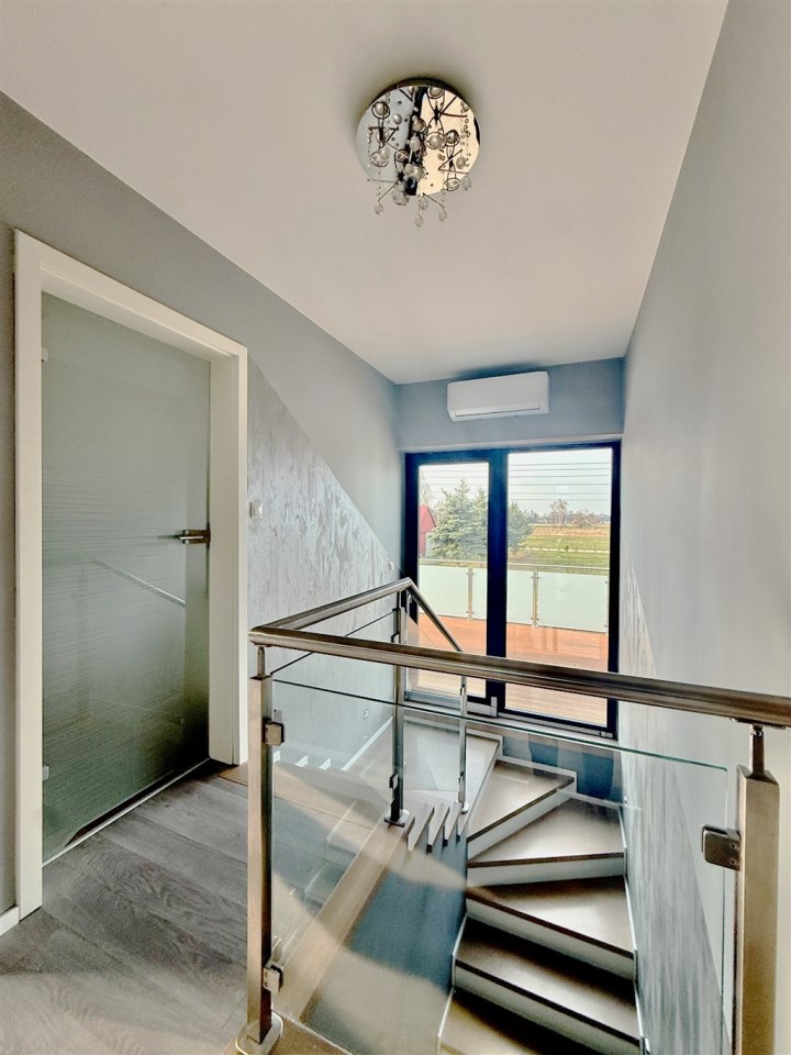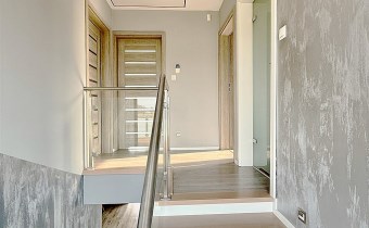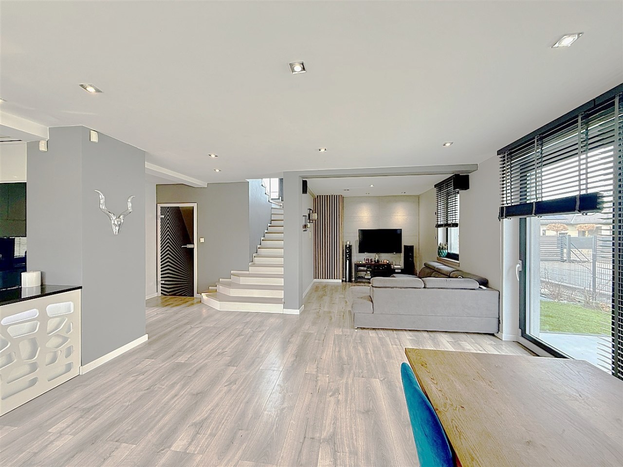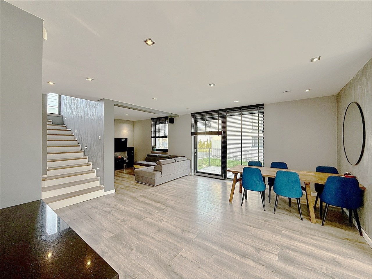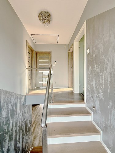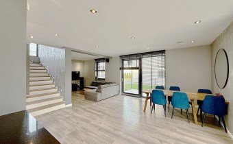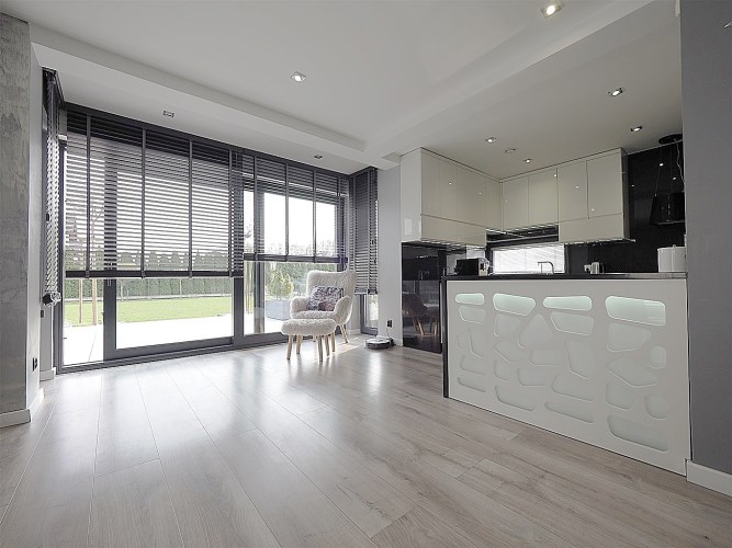 Wnętrza wykończone z dbałością o każdy detal – panele winylowe, schody wykończone bielonym dębem, gres w łazienkach i zabudowa kuchni z pięknymi blatami granitowymi.
