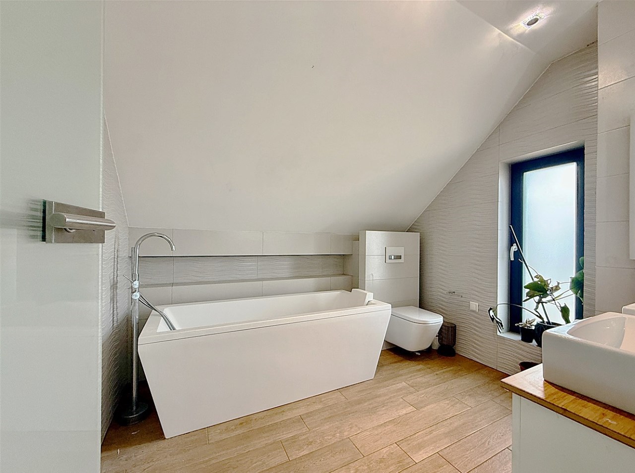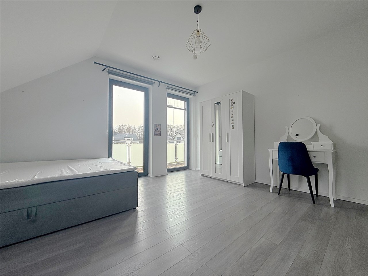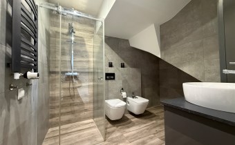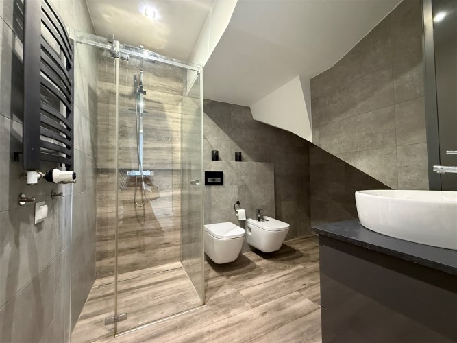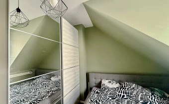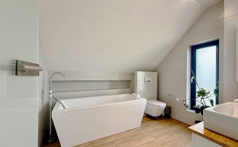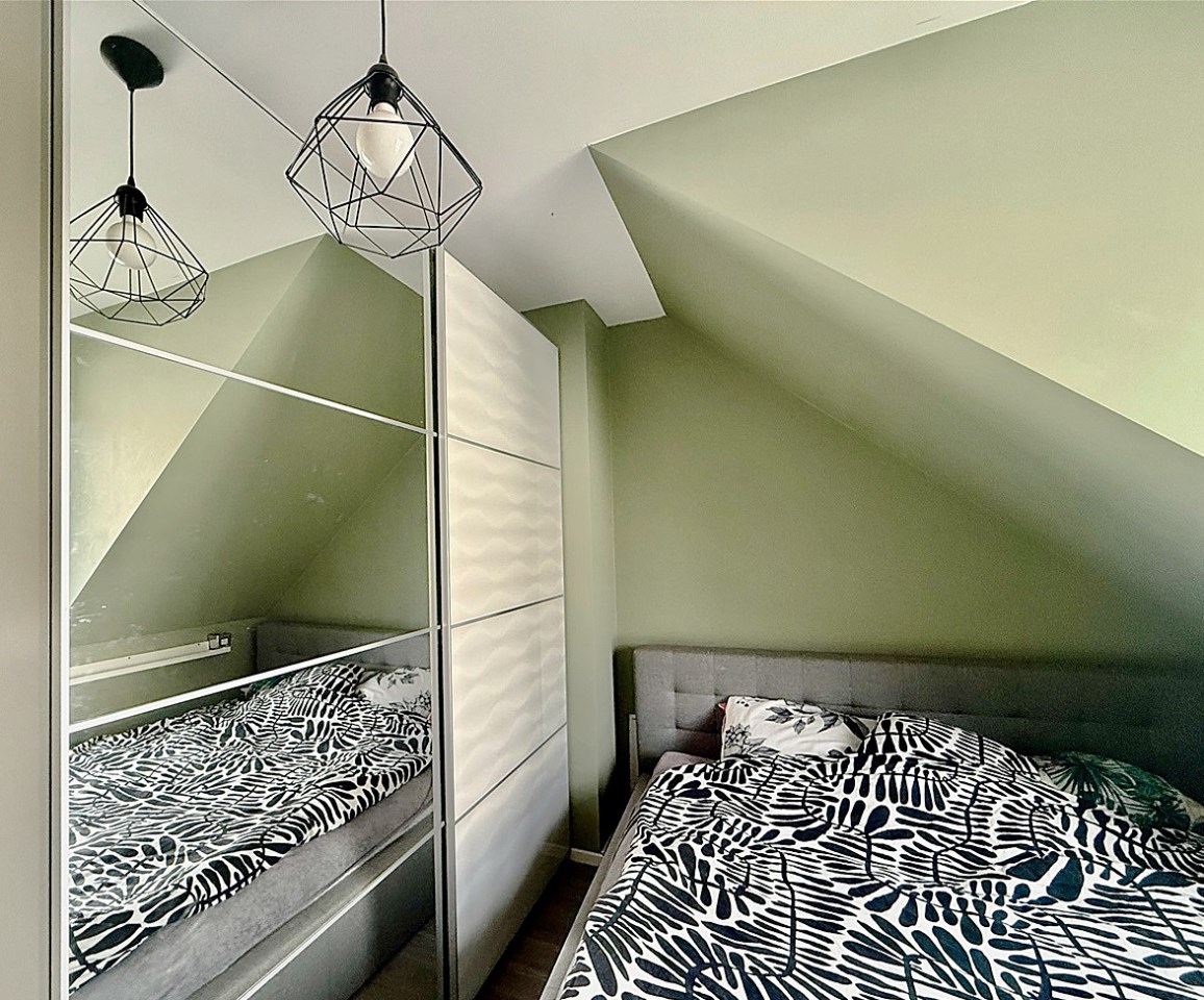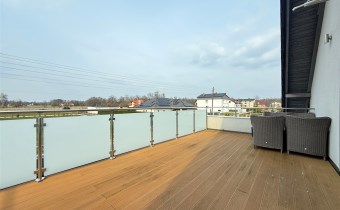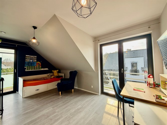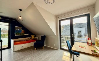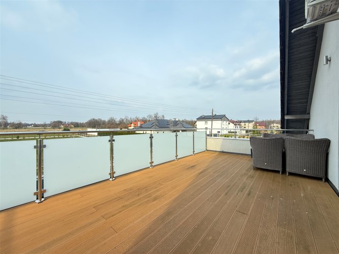 Poddasze: trzy jasne sypialnie, duża rodzinna łazienka, z półpiętra wyjście na duży taras o powierzchni ok. 30 m², wyłożony deską kompozytową.