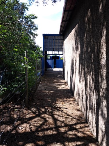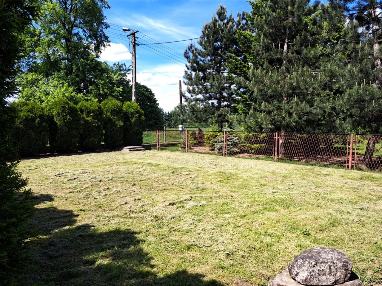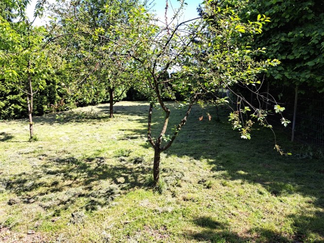 Tylna część działki funkcjonuje jako rekreacyjna, otoczona zielenią z drzewkami owocowymi.