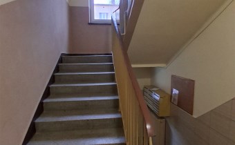 Klatka schodowa odmalowana, czysta. Wejście do klatki zabezpiecza domofon.