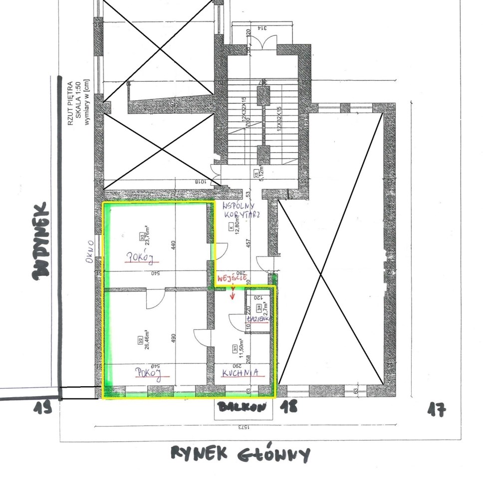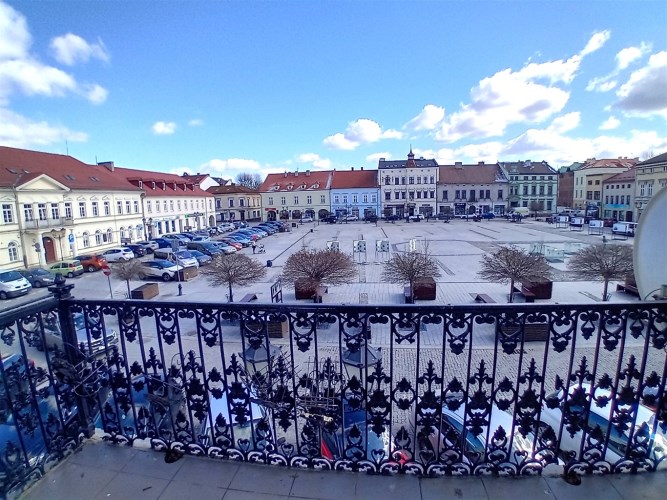 zlokalizowany jest od frontu kamienicy, z okien widok na Rynek Starego Miasta.