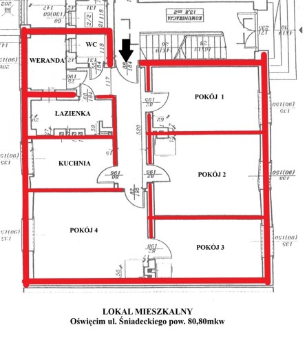 Lokal składa się z 4 dużych pokoi, kuchni, łazienki, oddzielnego WC oraz werandy.