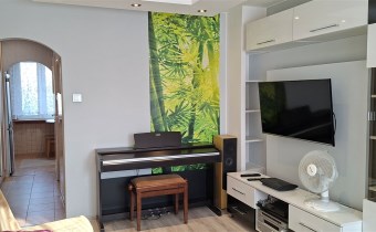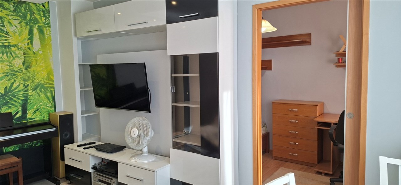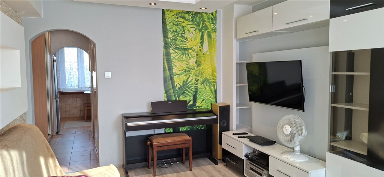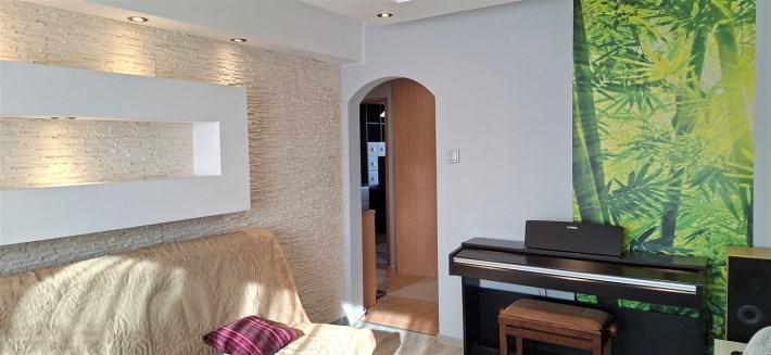 Mieszkanie o powierzchni 47,87 m2 w bardzo dobrym stanie składa się z dużego pokoju z wyjściem na balkon i przejściem do mniejszego oraz trzeciego, małego pokoju.
